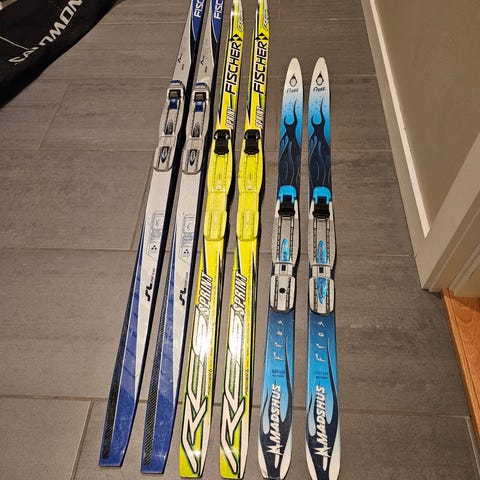 200 kr per ski par. 120 cm Frost langrennski med Rottefella-bindinger. Pakken består av to par ski, ett par i blått design og ett par i rosa/blått design. Begge parene har integrerte Rottefella NNN-bindinger montert. Ski og bindinger er egnet for klassisk langrenn. Farger og grafikk gjør dem godt synlige i løypa, og de passer godt til bruk på preparerte spor. Nøyaktig lengde og mål er ikke oppgitt og bør eventuelt måles ved interesse.