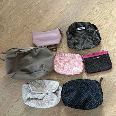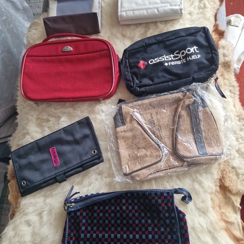 Toalettmapper til dame i stoff. Pakken inneholder flere små og mellomstore mapper i ulike farger og mønstre, egnet til oppbevaring av toalettartikler, sminke eller småting i veske eller koffert. Mapper i mykt stoffmateriale som kan brettes og tar liten plass ved oppbevaring og på reise. Den i fargen gull er en mobilmappe som gjør at mobilen ikke blir like kald ute i kulda! Litt flekker på noen av toalettmappene men det går nok av i vask! Selges samlet for 550kr!