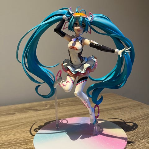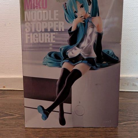Hatsune Miku figur i anime-stil laget i PVC-plast. Figuren viser karakteren i standard antrekk med turkist hår i to hestehaler, svart og hvitt kostyme og støvler. Leveres på en sekskantet sokkel som gjør den egnet til utstilling på hylle eller skrivebord. Passer som samleobjekt for anime- og figurinteresserte.