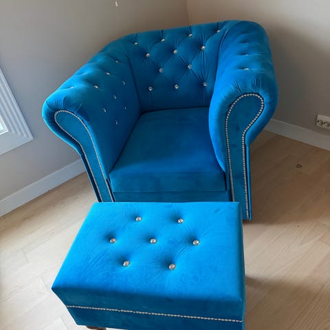 Selger en nydelig grønn designstol med puff pga flytting/plassmangel. Stolen + puffen er designet av den australske designeren Charles Wilson. Den ble med hjem i flyttelasset etter noen år med arbeid i Singapore. Stolen er i et fint grønt ullstoff. Den har designerens navn inngravert på foten. 🌱❤️