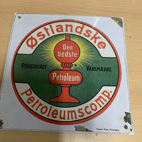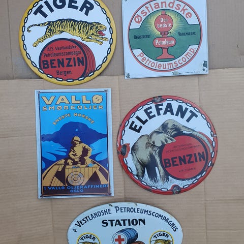 - det runde er 27 cm i diameter, med reklame for Tiger benzin og A/S Vestlandske Petroleumscompagni, og det kvadratiske er i str. 22,5 x 22,5 cm, med reklame for Østlandske Petroleumscompagni.