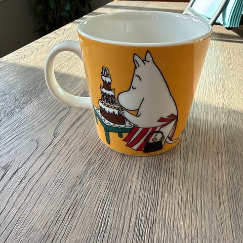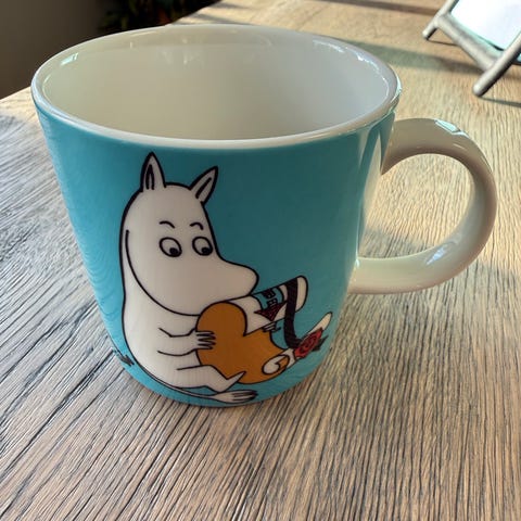 Arabia Moominpappa kopp i keramikk. Motivet viser Mummipappa i båt på mørkeblå bakgrunn. Koppen har hvit innside og hank. På undersiden er den merket «Moominpappa by Arabia». Egnet til bruk i oppvaskmaskin, mikrobølgeovn og ovn til bordservering, ifølge merkingen. Passer til servering av varme og kalde drikker ved frokostbordet, på kjøkkenet eller kontoret.