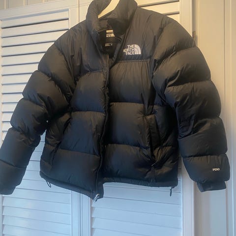 The North Face dun vinterjakke for herre i størrelse M. Jakken er svart og fylt med dun, med tydelig vattert mønster og høy krage. Glidelås i front og sidelommer. Passer som ytterjakke i kaldt vær. Det er 2 små hull på venstre skulderparti. Derfor selges den billig.