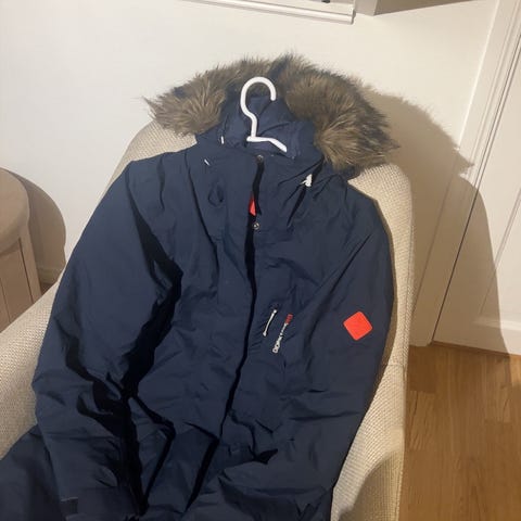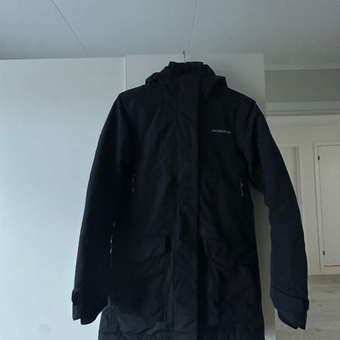 Didriksons ytterjakke for dame i størrelse M. Jakken er svart og laget i polyester. Den har hette og lengre passform som dekker nedover hofter og lår. Ytterjakken har STORMsystem-merke på innsiden, som angir vanntett materiale. Praktiske lommer foran og justeringsmuligheter ved ermer og hette for bedre passform. Egnet som allsidig ytterjakke i vått og kjølig vær.