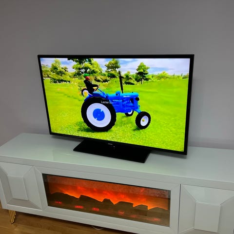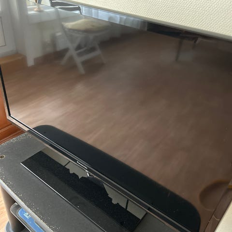 flatskjerm-TV. Modellen har veggfeste montert på baksiden, som vist på bildene. TV-en har flere tilkoblingsmuligheter (se tilkoblingspanel og modellskilt på baksiden for detaljer om porter og spesifikasjoner). Egner seg til vanlig TV-bruk, strømming og tilkobling av eksterne enheter som dekoder, spillkonsoll eller mediespiller, avhengig av tilgjengelige innganger på modellen.
