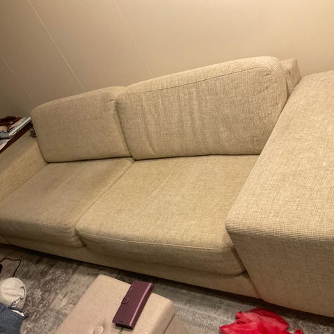 Sofaen er helt uten skader. Henger noe løst stoff under. Mulig det kan festes, men jeg har ikke prøvd. Ellers hel og den er god å sitte i. Har hund mtp allergi. Trenger en liten vask. Gis bort mot henting. Kan passe til liten stue, venterom, ungdomsrommet feks.