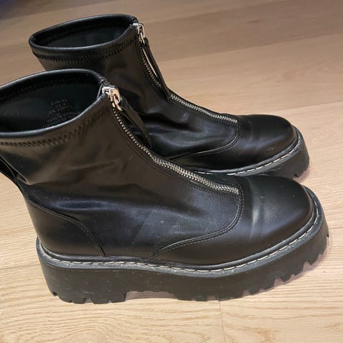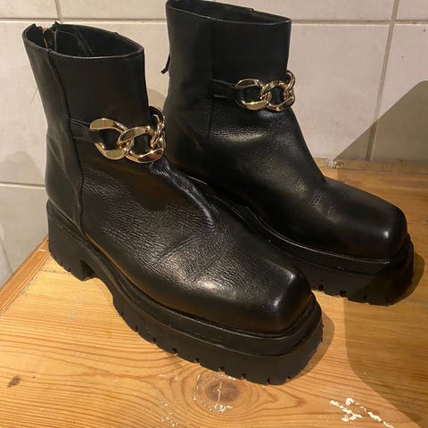 Nude of Scandinavia støvler i størrelse 39. Ankelhøye støvler i svart skinn med kraftig såle og dekorativ lenkedetalj foran. Glidelås bak på hælen for enkel av- og påtaking. Egnet til hverdagsbruk i kjøligere vær.