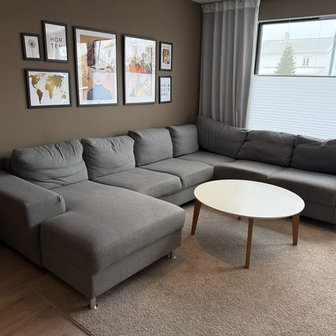 Gir bort denne mot henting, deles opp i 5 deler. På hvert av endene er det mulig å slå ut for beinstøtte, så den kan fungere som en lenestol. Se bilder. Beste sofaen vi har hatt, kjempe god å sitte i. Ble renset for et par måneder siden. Må bæres opp av kjellerleilighet.