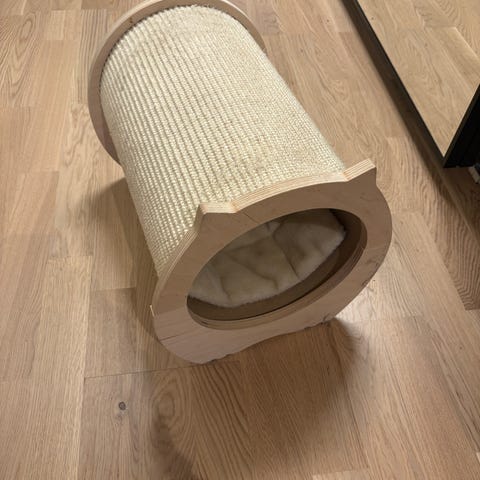 Kattetunnel i beige tekstil. Tunnelen kan foldes sammen for enkel oppbevaring og har åpning i siden som gir ekstra inngang/utgang for katten. Egnet som leke- og gjemmested for katt innendørs.