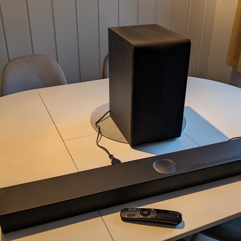 Selger en Samsung HW-Q90R, en kraftig premium soundbar med 7.1.4 Dolby Atmos inkl trådløse bakhøyttalere og subwoofer. Modellen var en toppmodell og er fortsatt kjent for svært god lydkvalitet og høy ytelse på både film, TV og musikk