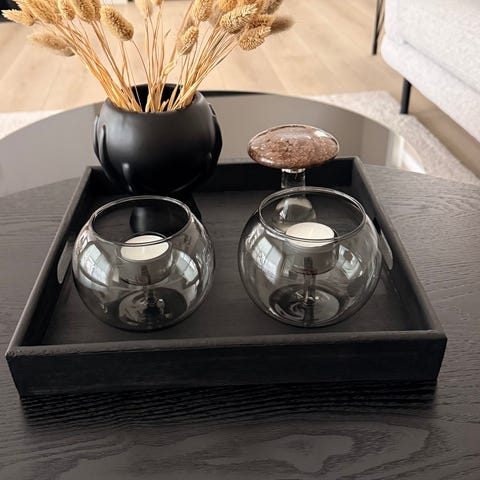 Lysestaker med plass til stearinlys på den ene siden og telys på den andre med plass til dekorasjon i klart glass. Består av runde glassbeholdere med avtagbart lokk, egnet til små dekorasjoner som kongler, granbar eller andre sesongbaserte elementer. Like fin med julepynt, påskepynt eller blomster om sommeren.