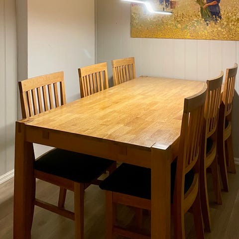 2000kr for alt🙂 norsk produsert, eik? 6 stoler til spisebordet og bore kan forlenge med en meter, plata ligge under bore