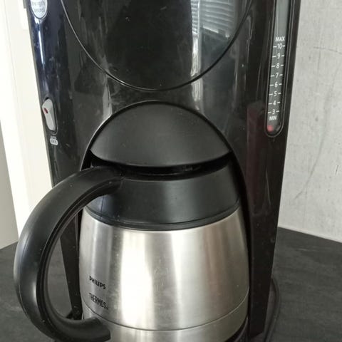 Philips Café Roma kaffetrakter i hvit farge med glasskanne og svart håndtak. Maskinen har vannbeholder på baksiden med nivåindikator og enkel av/på-bryter på fronten. Noen år gammel men pent brukt.