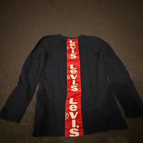 Levi's genser for herre i størrelse S. Genseren er blå og laget av bomull. Den har rund hals, lange ermer og ribbestrikkede kanter i hals, ermer og nederkant. På brystet er det et tydelig Levi's-logo i kontrastfarge.
