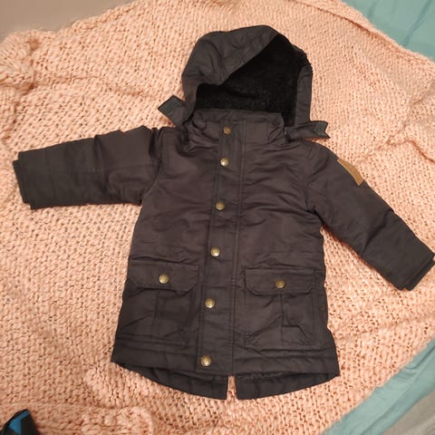 Adidas jakke for gutt i størrelse 86. Jakken er blå med hvite detaljer og har hette. Lukkes med glidelås foran. Egnet som ytterjakke til barn i aktuell størrelse.