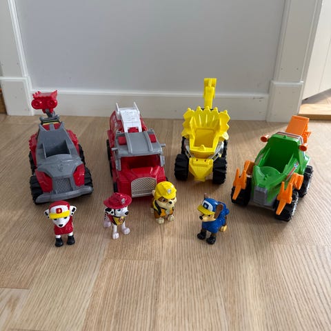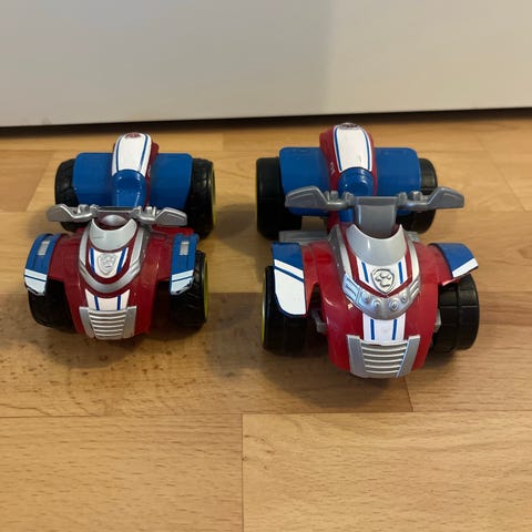 Paw Patrol lekefigur med kjøretøy. Figuren sitter fast i et firehjuls kjøretøy i rødt, blått, hvitt og grått. Leken er laget i plast og passer som rollelek for barn som liker Paw Patrol-universet. Egnet som enkel lekebil eller som del av en større Paw Patrol-samling.