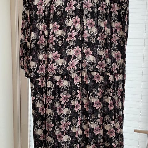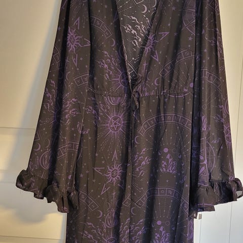 Mørk grå kjole med litt mønster på skjørtet. V-utringing. Innfelt bånd / belte i livet som kan reguleres. Skjørtet faller fint. Lengde ca 135 cm. Str XXL.