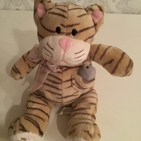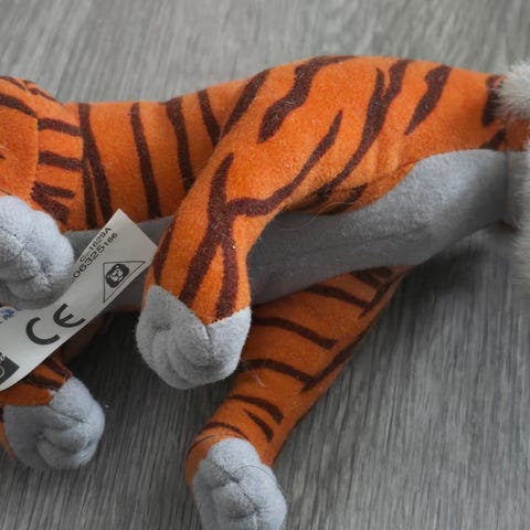 kosedyr tiger. Mykt, stort plysjdyr formet som en liggende tiger med karakteristiske striper og detaljer. Egnet som kosedyr eller dekorasjon på barnerom og lekerom