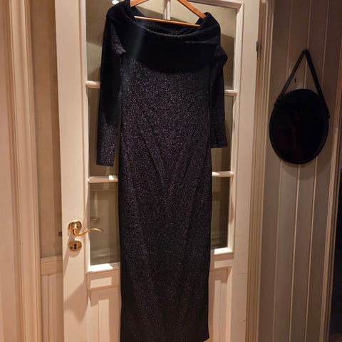 Gina Tricot festkjole for dame i størrelse L. Lang, svart kjole i satengmateriale med høy hals og lange ermer. Aldri brukt, bare tok etiketter.