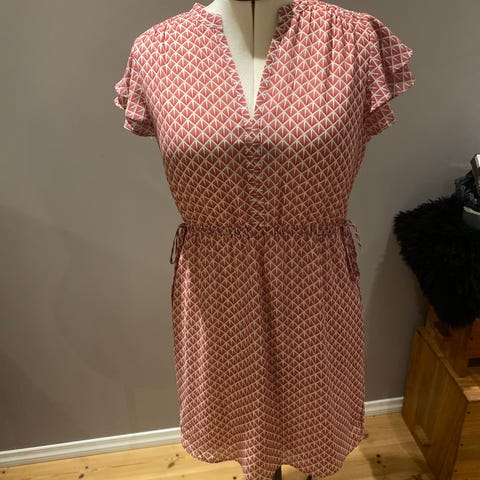 Noa Noa hverdagskjole for dame i størrelse M. Kjolen er laget i viskose og har et flerfarget mønster. Modellen har korte ermer og knapping i halsen. Stoffet er lett og faller mykt. Passer som hverdagskjole eller til enkle anledninger. Materiale og vaskeanvisning følger merkelappen fra produsenten.
