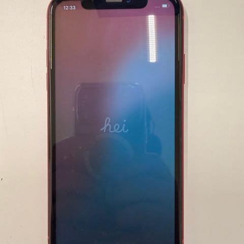 Apple iPhone 11 mobiltelefon i rød farge. Modellen har skjerm med heldekkende design og Face ID-sensor i front. Baksiden har to hovedkameraer plassert i et kvadratisk kamerafelt øverst til venstre. Enheten har Lightning-port for lading og dataoverføring, samt fysiske volum- og strømknapper på sidene. Passer til bruk som smarttelefon til tale, meldinger, apper, foto og video. Spesifikke detaljer som lagringskapasitet og annet tilbehør er ikke oppgitt.