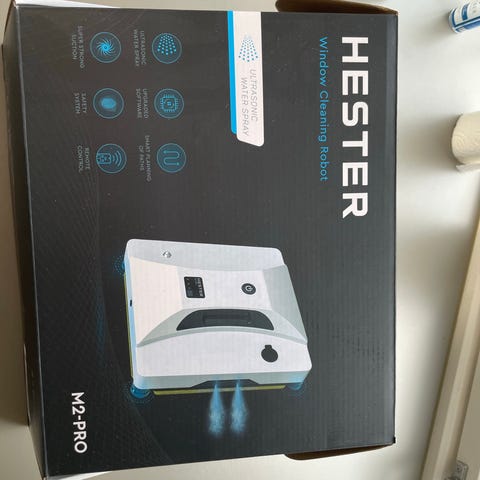 Hester M2-Pro vindusvasker robot i hvit utførelse. Enheten er utformet for automatisk rengjøring av vinduer og glatte overflater. På bildene følger det med strømforsyning med kabel samt vaskekluter/pads som festes på undersiden av roboten. Apparatet har av/på-knapp på oversiden og tilkobling for strømledning. Egner seg til innendørs og utendørs bruk på plane glassflater eller fliser der man ønsker jevn og automatisk rengjøring.