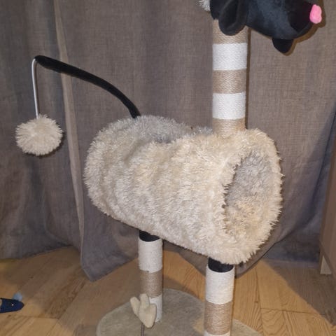 Meget søt klatrestativ i fin design som kan være pyntegjenstand i stua eller et annet rom. Stammen er surret med sisal for kloring. Øverst er det en toppdel formet som geithode med horn. Egnet som liggeplass, gjemmested og klorestativ for katt i innemiljø. Ca 70-80 cm høy. Ca 50 cm i diameter.