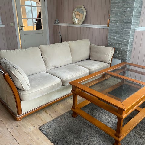 sofagruppe bestående av sofa og lenestoler designet . Møblene har klassisk form med avrundede armlener og stoppede puter. Treverket er lyst, mens tekstilet har et mønstret trekk i nøytrale toner. Passer som sittegruppe i stue eller hytte, med god sitteplass i sofaen og romslige lenestoler som gir mulighet for avslappet seating. Designet kombinerer tradisjonelle linjer med et tidløst uttrykk.