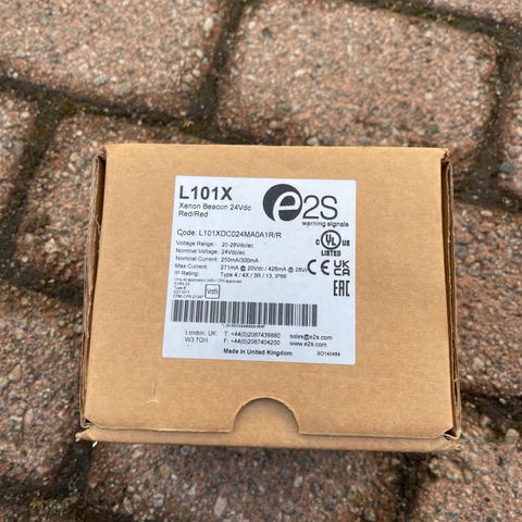 E2S A105N alarmsirene i rød farge. Industriell sirene beregnet for bruk i varslings- og alarmsystemer. Enheten har firkantet horn og monteringsfester på baksiden for fast installasjon på vegg eller annen flate. Tekniske spesifikasjoner, elektriske data og godkjenninger fremgår av merkeskiltet på produktet og på esken. Egnet for bruk der det er behov for tydelig akustisk varsling i industrielle eller kommersielle miljøer.