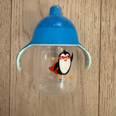 Kopp til å øve med for å mestre å drikke av kopp. Greit lokk med så den blir sølesikker.