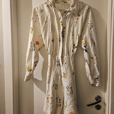 Hjemmelaget sommerkjole for dame i størrelse S. Kjolen er i blåtoner med hvitt mønster foran og bak. Er sydd i et tynt bomullsstoff. Modellen har knelengde og trekvart lange ermer. Glidelås i ryggen for lukking. Passer til bruk på varme dager eller som lett hverdagskjole.
