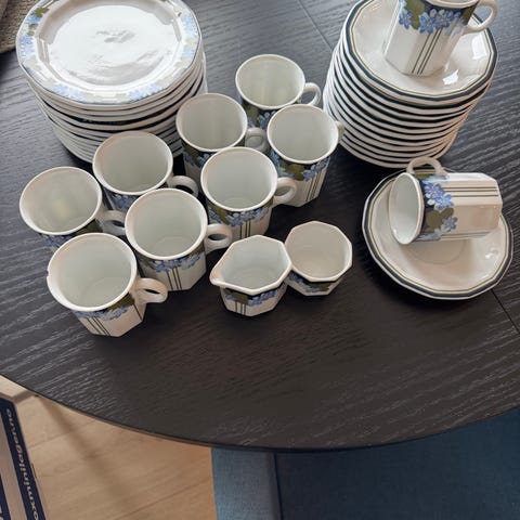 5 kaffe kopper med tefat til pluss en kaffe kopp uten tefat pluss en fløte mugge selges samlet for 400 kr . Kan sendes med post nord for 135 kr eller posten for 140 kr eller fiks ferdig eller kan hentes etter avtale . Pakker godt i bobleplast og papir ved sending .