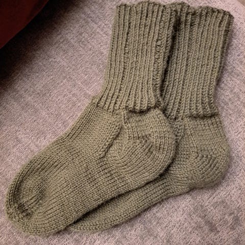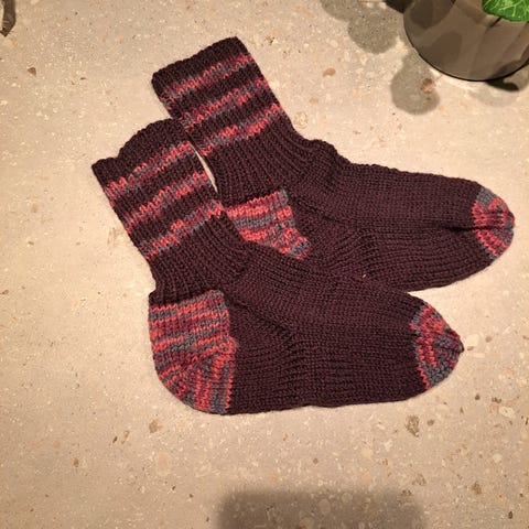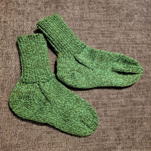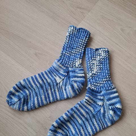 Ullsokker i grå farge. Strikket modell med ribbestrikket skaft og kontrastkant øverst. Egnet som varme sokker til hverdagsbruk eller til tur og friluftsliv. Flere par i samme type vises på bildene.