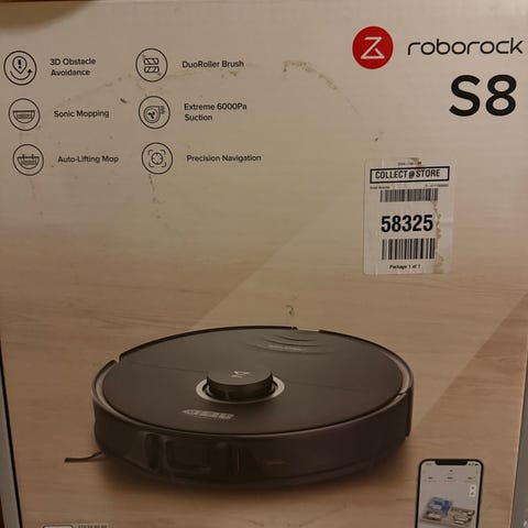 Roborock S5 Max robotstøvsuger med mopp. Modellen har stor elektronisk vanntank for våtmopping, mulighet for å definere no-mopp-soner og romvalg, samt kraftig sugekraft for støvsuging av gulv. Pakken inneholder Roborock S5 Max robotstøvsuger, ladestasjon, moppemodul med klut, vannbeholder og tilbehør som beskrevet på esken. Egnet for automatisk støvsuging og mopping av harde gulv i hjemmet.