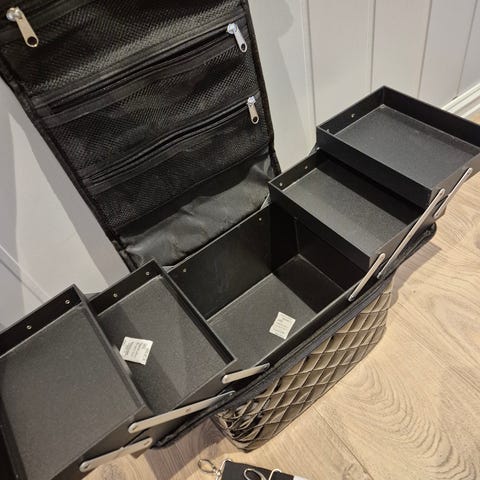 Mary Kay sminkebag i svart farge. Vesken har polstret, vattert utside med kontrastsømmer og doble bærehåndtak. Innvendig er det flere rom og lommer til organisering av sminke og tilbehør.