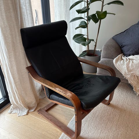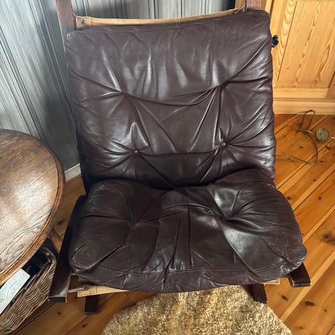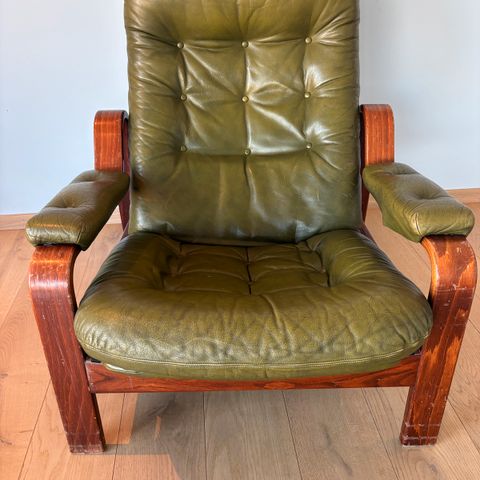 Vintage godstol/lenestol i skinn. Noe slitent i skinnet på setet. Må hentes i Fjordgata