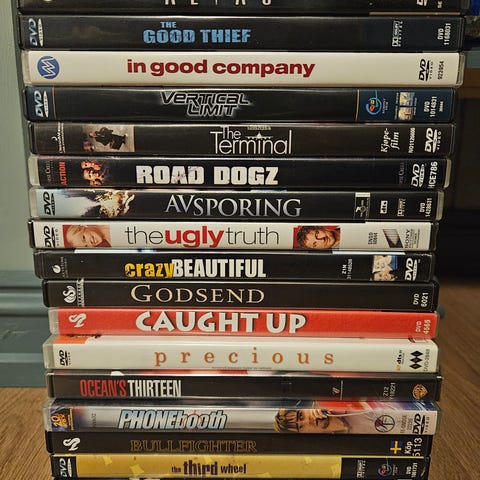Samling med ulike DVD-filmer i standard DVD-format. Bildet viser flere titler i original DVD-emballasje. Egnet for deg som ønsker fysiske utgaver av filmer i DVD-format til hjemmekino eller samling. Eventuelle detaljer om språk, teksting og aldersgrense vil variere mellom de enkelte DVD-platene og fremgår vanligvis på omslaget.
