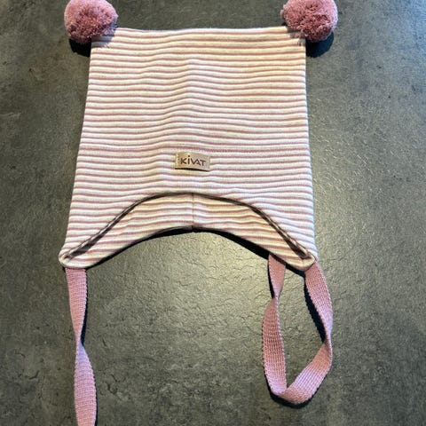 Kivat lue i str 68 for unisex baby. Lua er i beige bomull med stripemønster og knytebånd under haken for å sitte godt på hodet.