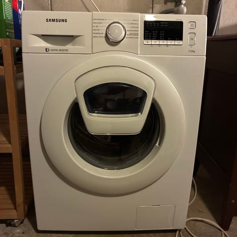 Samsung frontmatet vaskemaskin i hvit utførelse. Maskinen har frontåpning med rund dør og ekstra luke i døren for etterfylling av tøy under vask. Den er utstyrt med digitalt display og programvelger på fronten, samt flere vaskeprogrammer som kan tilpasses ulike tekstiltyper og behov. Maskinen har digital inverter-teknologi, som gir jevn drift. Egner seg til vanlig husholdningsbruk med plassering frittstående på gulv, for eksempel på bad eller vaskerom.w