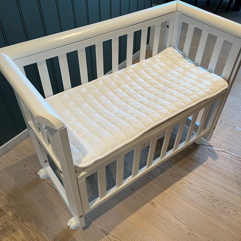 Sengen har justerbar høyde, senkbar side og hjul, og kan brukes tett inntil foreldreseng.