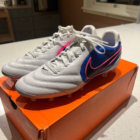 Nike Tiempo fotballsko i svart og hvit farge. Overdel i mykt materiale med lisser for justerbar passform. Knotter tilpasset bruk på gressbane. Skoene har Nike-logo på siden og hælen, samt Tiempo-merking bak. Egnet som fotballsko til trening og kamp på naturgress og kunstgress. STØRRELSE: 44