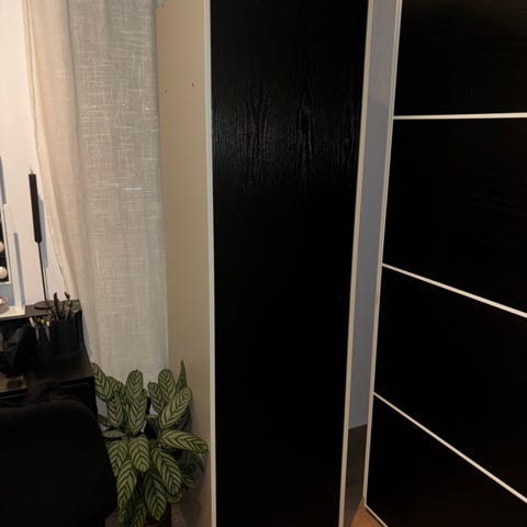 To stk bokhyller, 2meter høye m/hyller + en mindre modul som kan monteres på toppen av bokhyllen for å få den helt opp i taket.
