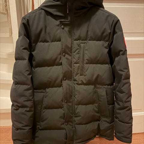 Canada Goose vinterjakke for herre i størrelse M. Jakken er svart og fylt med dun. Den har hette med pelskant, høy krage og hel glidelås med klaff foran. Modellen har flere ytterlommer med klaff og ribbestrikkede mansjetter i ermene. Yttermaterialet er laget for å tåle kaldt vær, mens dunfyllet gir god isolasjon. Passer som varm vinterjakke til hverdagsbruk og utendørsaktiviteter i kaldt klima.