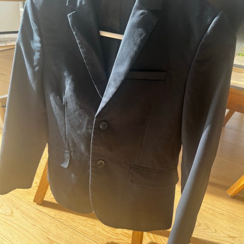 Lindex blazer for gutt i størrelse 140. Blazeren er svart og laget i polyester. Modellen har klassisk krage, to knapper i front og lommer foran. Egnet til bruk ved formelle anledninger som selskap, konfirmasjon eller andre høytider, samt til penere hverdagsbruk.