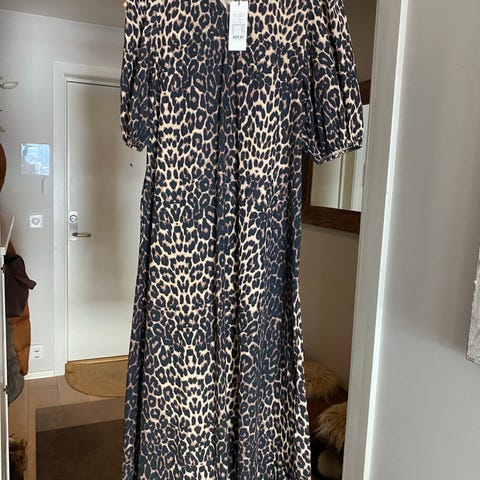 Happy Holly hverdagskjole for dame i størrelse 48. Kjolen er svart med lite blomstermønster og er laget i polyester. Modellen har rund hals, knappelukking i nakken og middels lange ermer med lett puff og strikk nederst. Skjørtet er langt med lett vidde og delte sømmer som gir et fallende uttrykk.