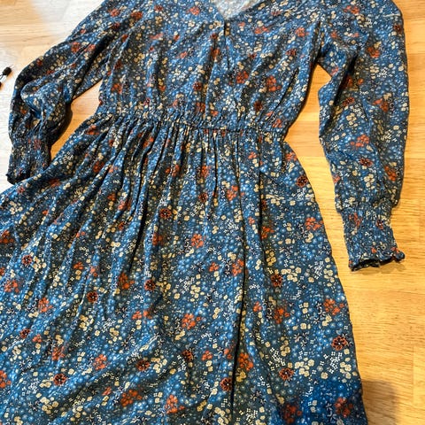 Careless hverdagskjole for dame i størrelse M. Kjolen er grønn med små blomsterdetaljer og er laget i viskose. Den har lange ermer med strikk ved håndleddene og innsmlgning/smocking i overdelen som gir en tettere passform rundt brystet. Skjørtet er lett utsvinget med rynker fra livet og ned, som gir god bevegelse. Passer som hverdagskjole eller til enkle anledninger.
