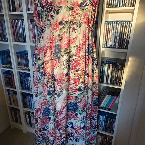 Vero Moda sommerkjole for dame i størrelse XL. Kjolen er flerfarget med blomstrete mønster og tynne stropper. Materialet er polyester, med fôring i polyester. Passer som lett sommerkjole eller til hverdagsbruk.