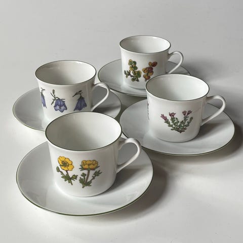 Selger 6 stk. vintage asjetter fra Porsgrund i serien Fjellflora. Norsk design. Fjellflora er basert på modellen "Regent" designet av Tias Eckhoff og med dekor av Dagny Tande Lid. Disse asjettene har dekor med blåklokke, rødsildre, greplyng, bergveronika, issoleie og dvergbjørk. Produsert i Porsgrunn fra 70-tallet. Bra stand. 60 kr per stk. eller 300 kr samlet. Kan hentes (Grünerløkka eller Sentrum) eller sendes.