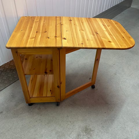 FLYTTA Trancherbord, rustfritt stål, 98x57 cm IKEA trillebord i stål med tre hyller og hjul for enkel flytting. Bordet har en robust konstruksjon i metall og passer til oppbevaring eller som arbeidsbord i kjøkken eller verksted. Har spor av bruk. Transport mulig mot et tillegg i prisen