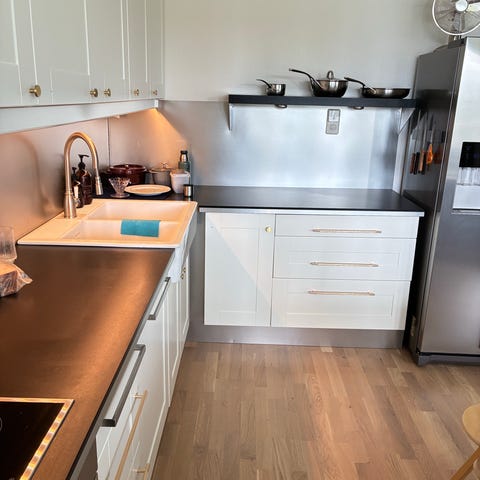 Kjøkkenet selges uten hvitevarer.